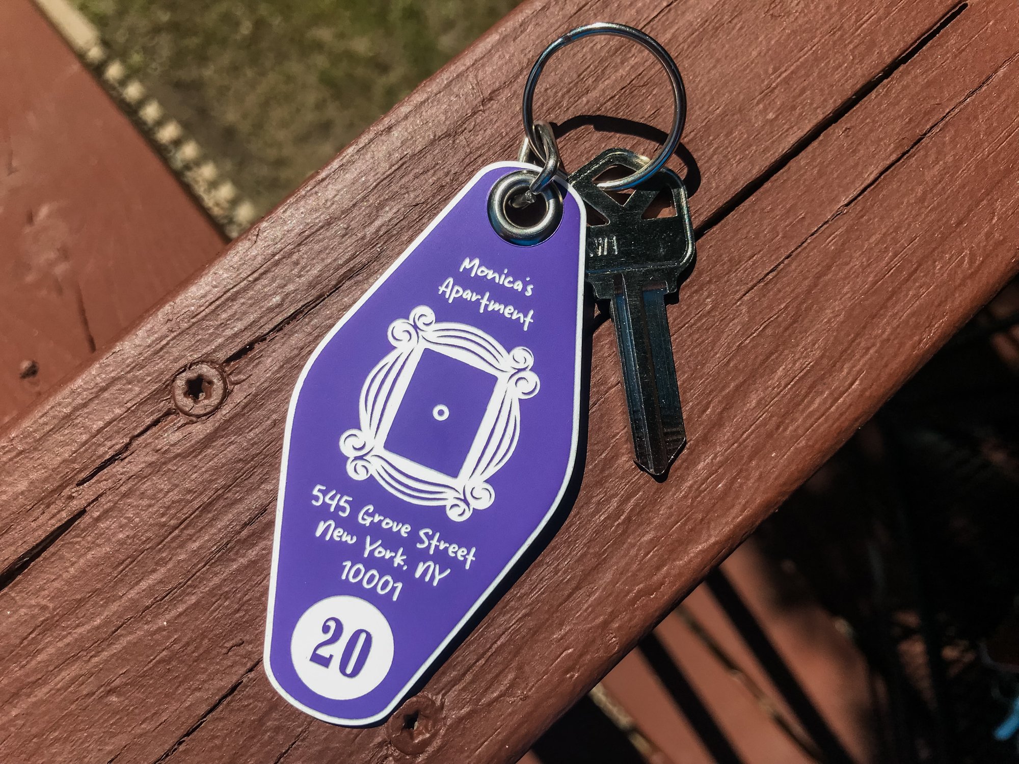 In tribute to the infamous series "Friends", this purple and white key tag, outfitted with a blank placeholder key, is designed in tribute to Monica's apartment - a prominent location featured throughout the series. The tag is acrylic and the design has been laser engraved into the tag. Each tag is 3.5” by 1.75" and very sturdy! Each key tag is also nestled in a reusable drawstring muslin pouch.