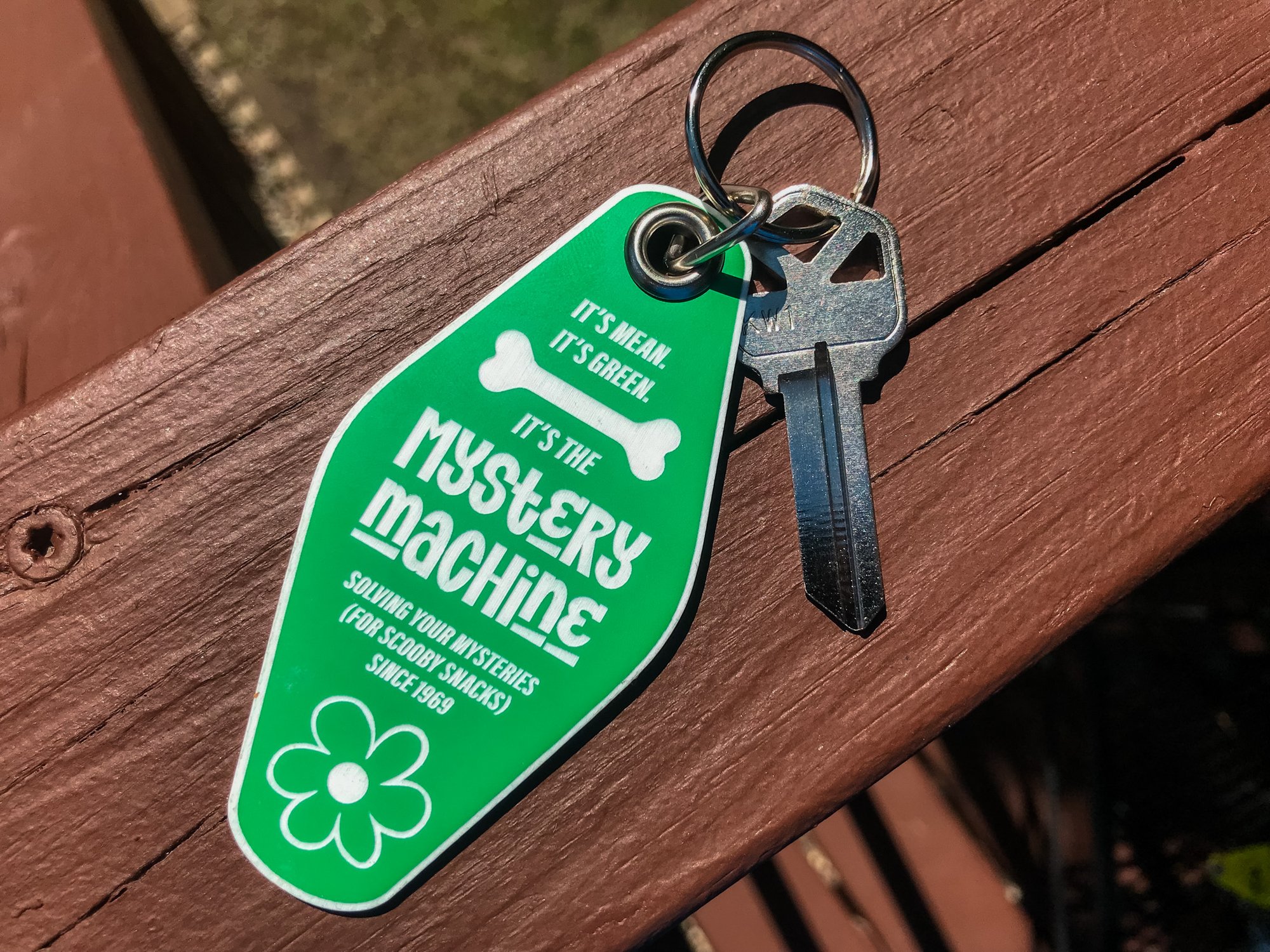 In tribute to the infamous Mystery Inc. gang, this green and white key tag, outfitted with a blank placeholder key, is designed in tribute to the “Mystery Machine” - a prominent vehicle featured throughout the gang's adventures. The tag is acrylic and the design has been laser engraved into the tag. Each tag is 3.5” by 1.75" and very sturdy! Each key tag is also nestled in a reusable drawstring muslin pouch.