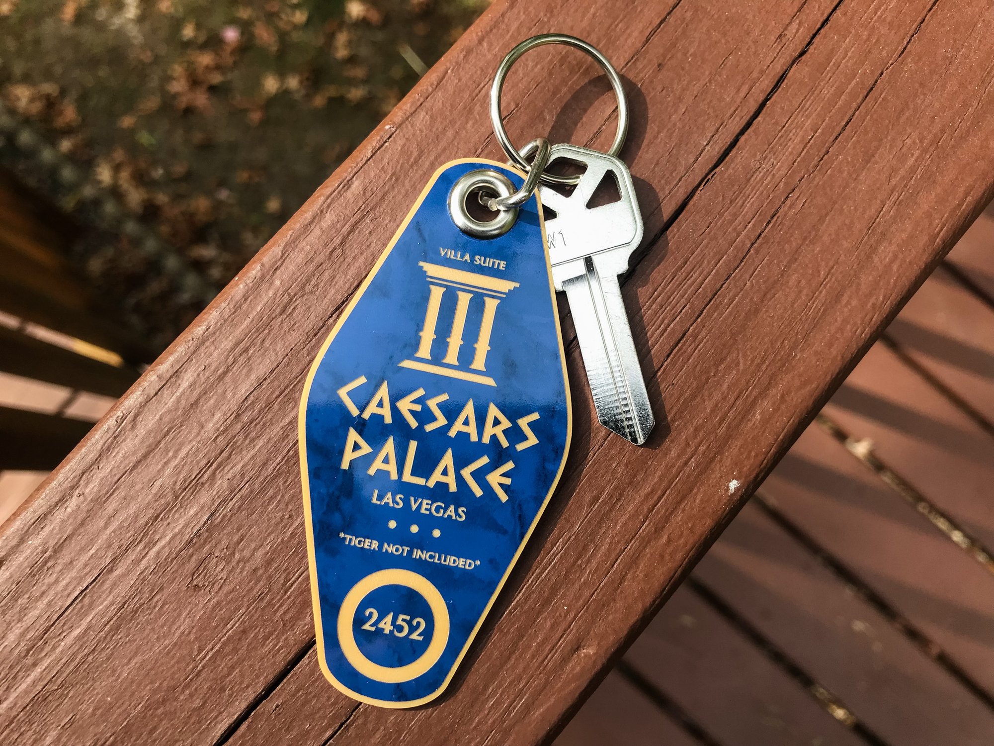 In tribute to the infamous film "The Hangover", this blue marble and gold key tag, outfitted with a blank placeholder key, is designed in tribute to the suite that "The Wolf Pack" occupied in Caesar's Palace - a prominent location featured in the movie. The tag is acrylic and the design has been laser engraved into the tag. Each tag is 3.5” by 1.75" and very sturdy! Each key tag is also nestled in a reusable drawstring muslin pouch.